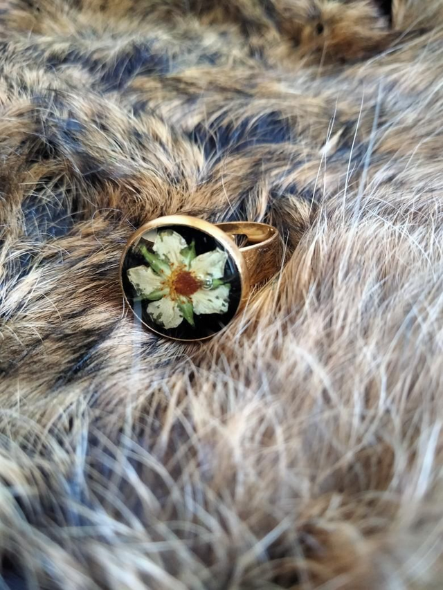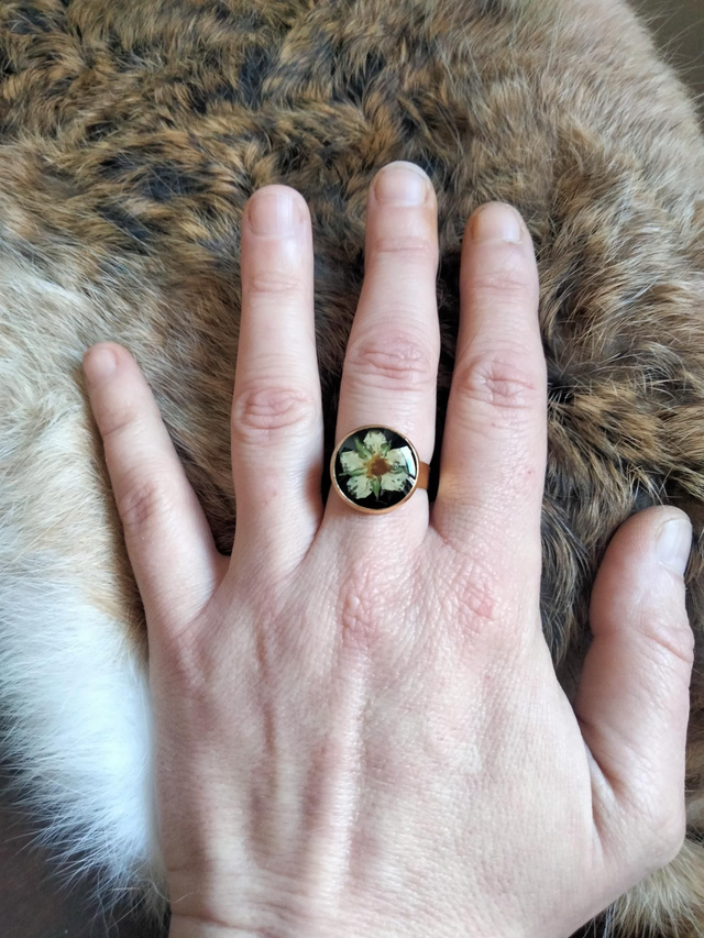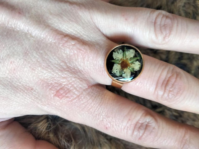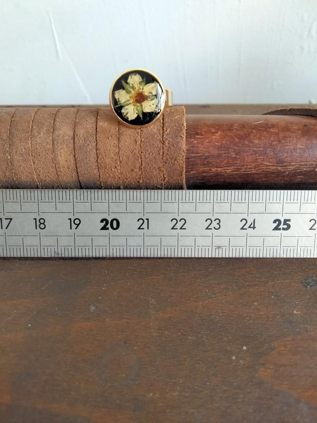 Bague réglable forme ronde couleur or avec inclusion d'une fleur séchée