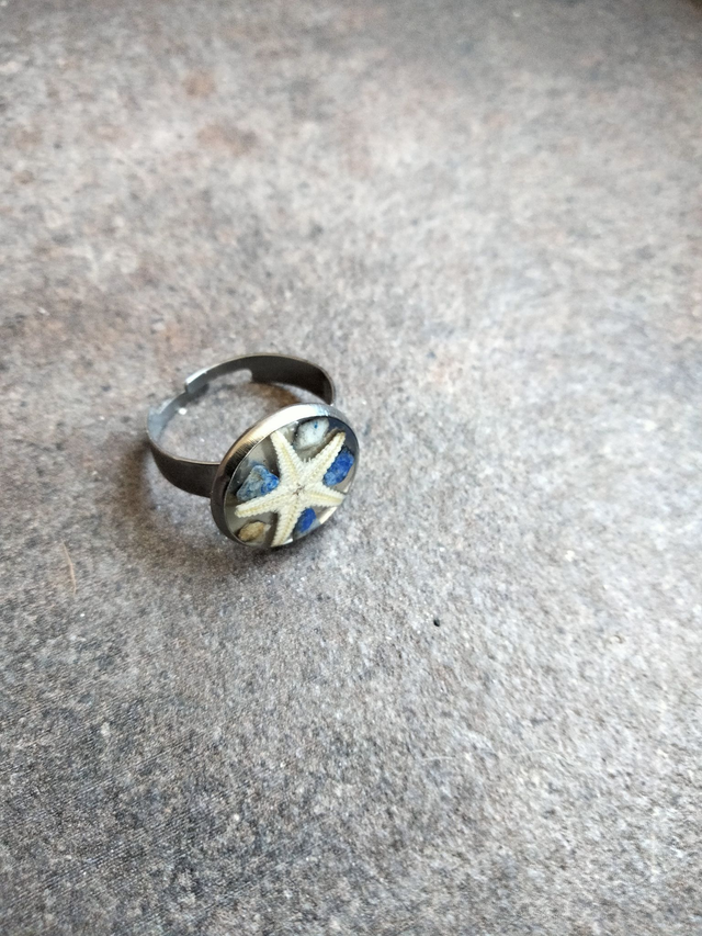 Bague réglable forme ronde en laiton couleur argent avec inclusion d'une étoile de mer et de pierres semi précieuses par de la résine époxy. Pierres utilisées : lapis lazuli et turquoise
