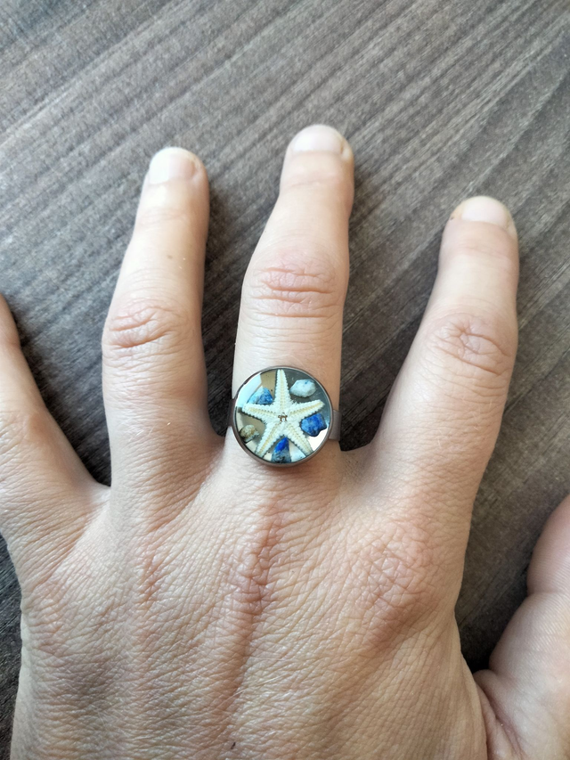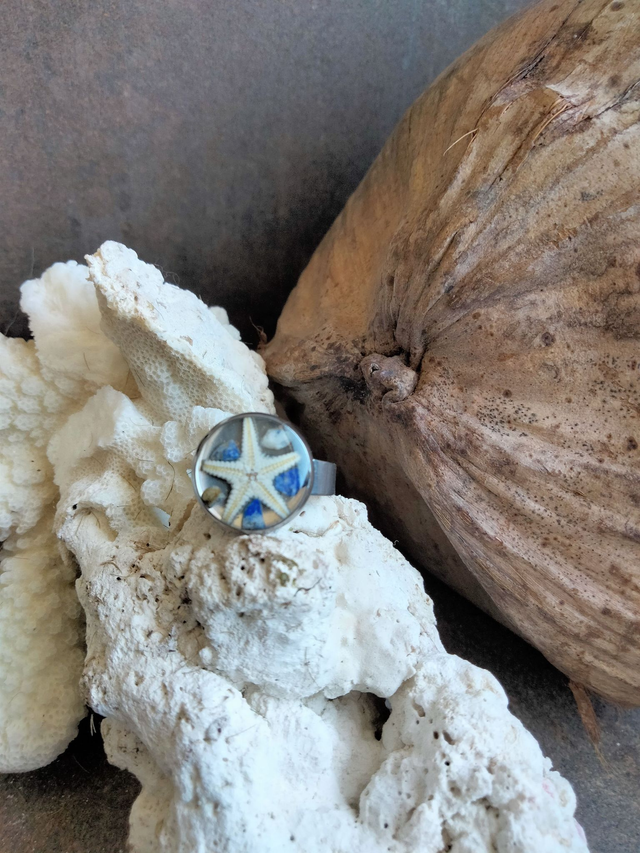 bague réglable forme ronde en laiton couleur argent avec insertion d'une étoile de mer