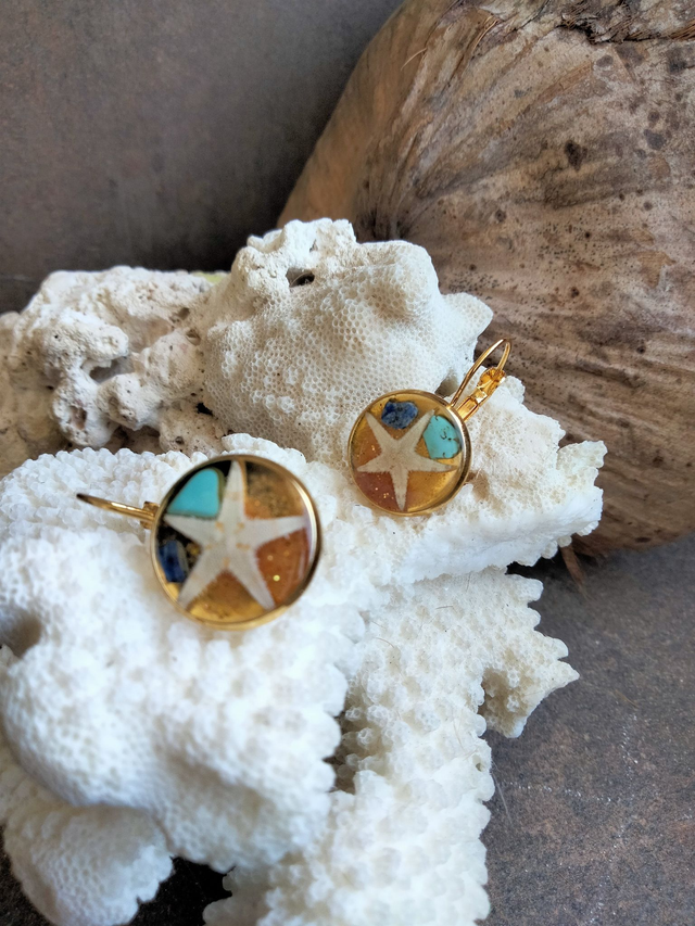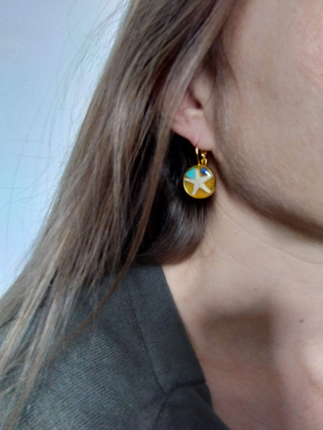 Boucle d'oreille crochet en laiton forme ronde couleur dorée avec insertion d'une étoile de mer avec de la résine époxy