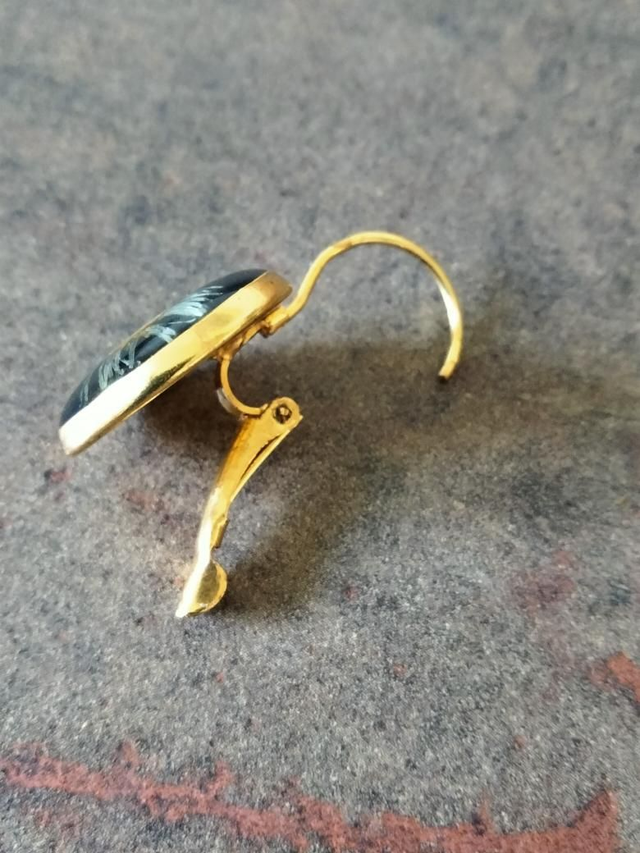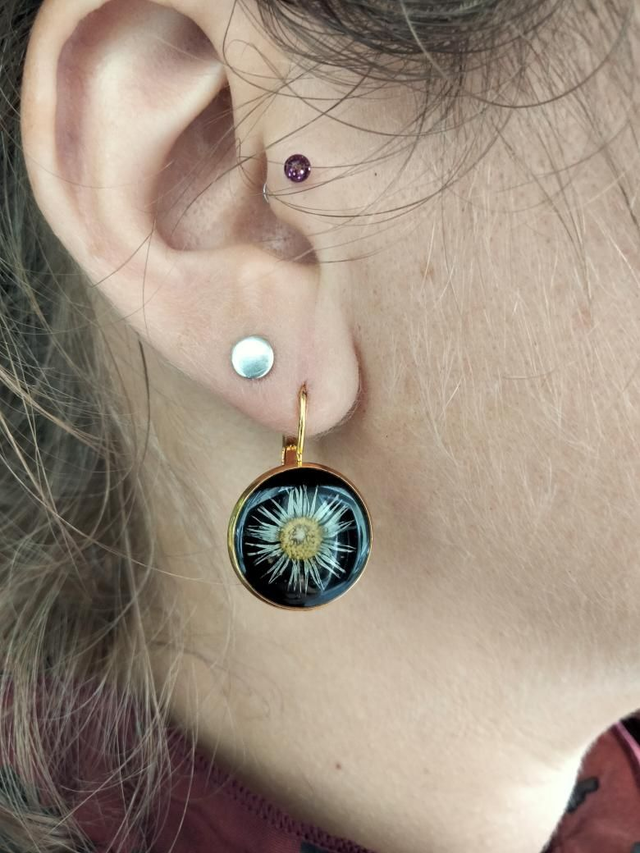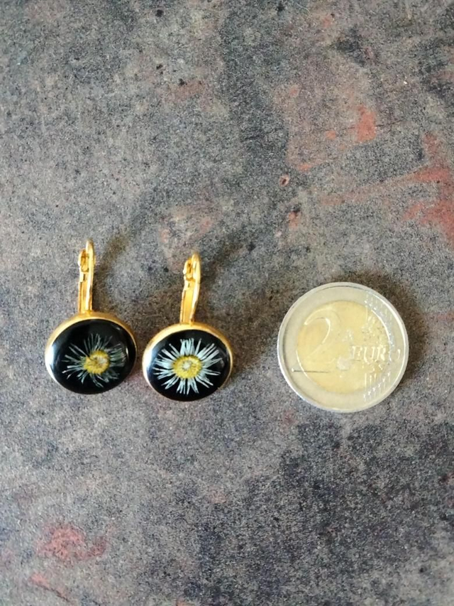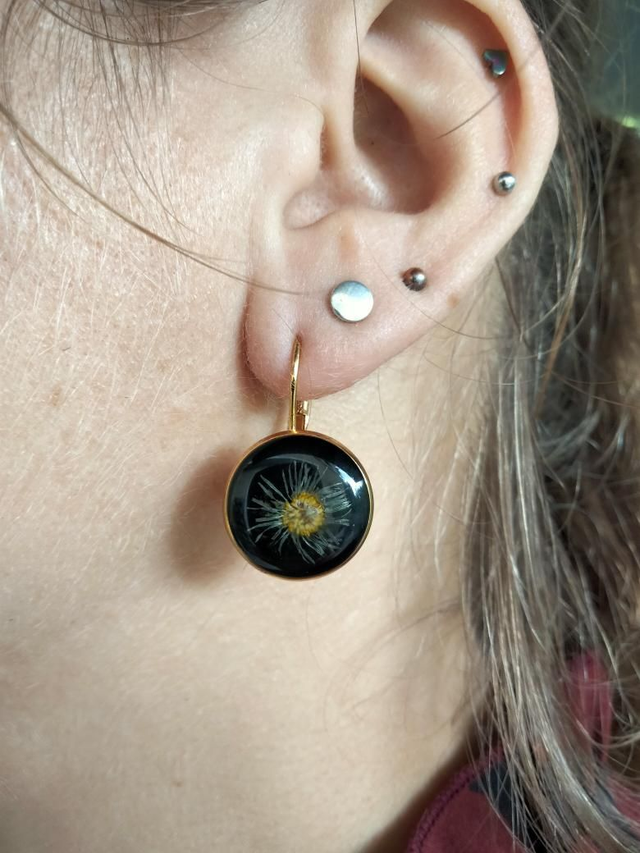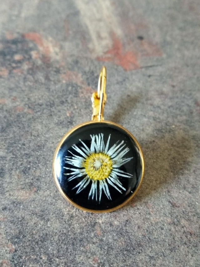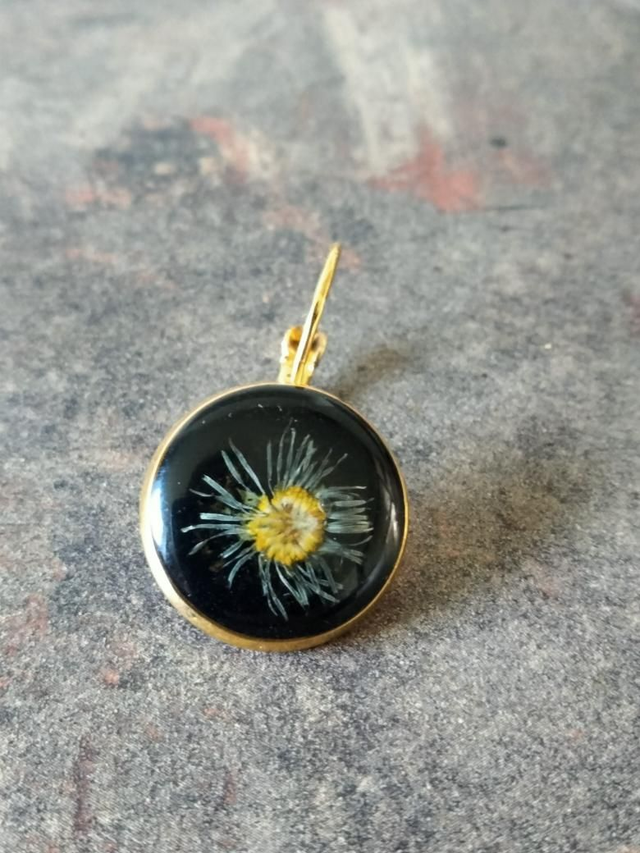 Boucles d'oreilles pendantes crochet couleur dorée fond noir avec inclusion d'une fleur de pâquerette séchée avec de la résine époxy.