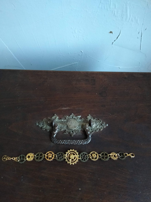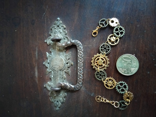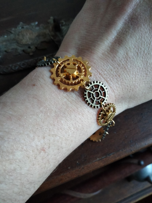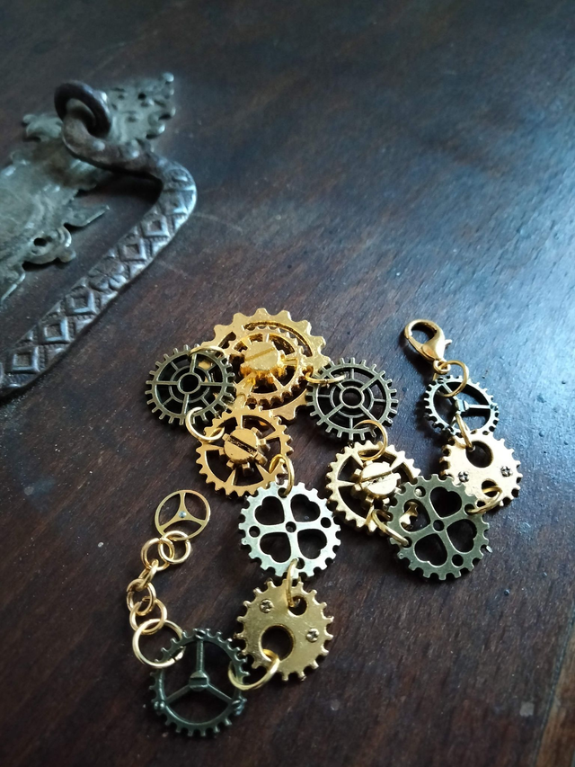 Le bracelet a été réalisé à partir d'un assemblage d'engrenage breloque or et bronze.