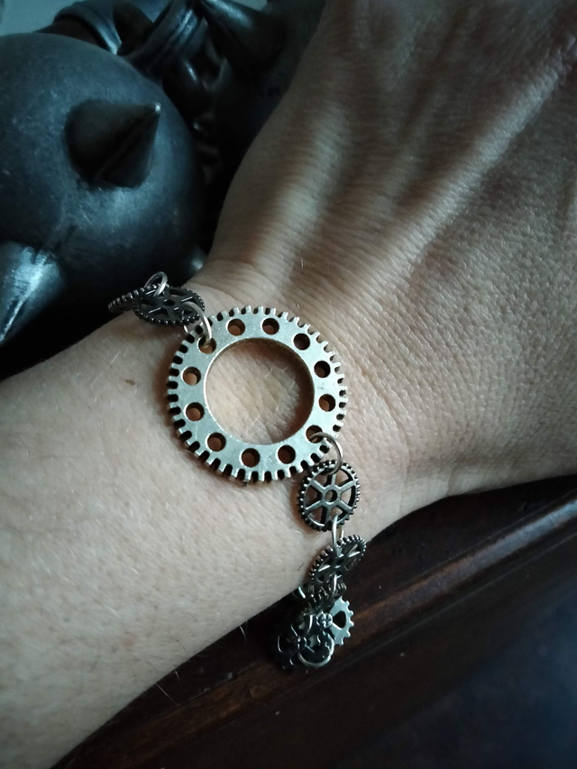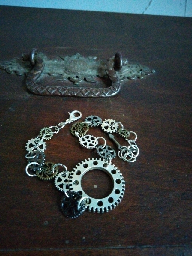 Le bracelet a été réalisé à partir d'un assemblage d'engrenage breloque couleur argent et bronze.