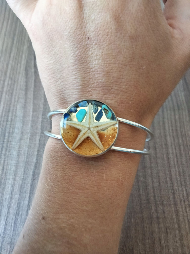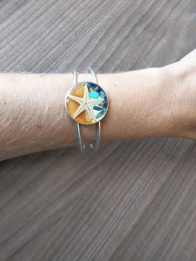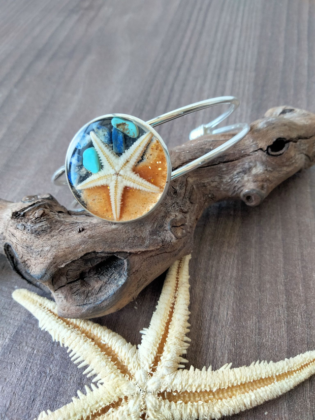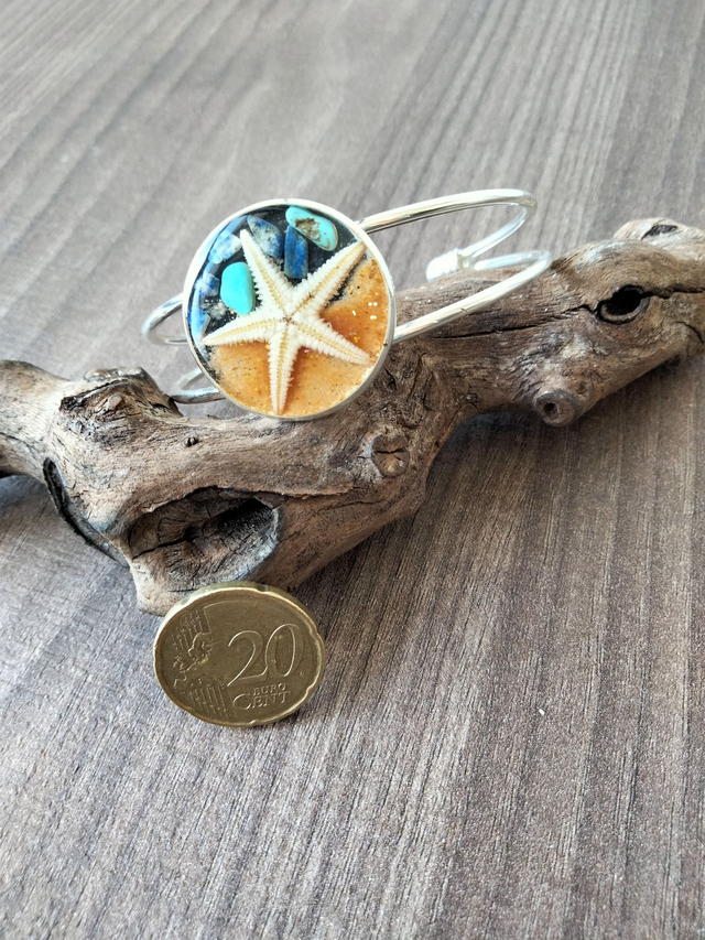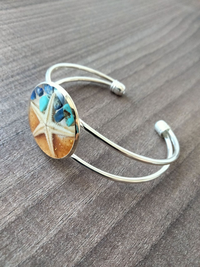 Bracelet manchette réglable en laiton couleur argent avec insertion d'une étoile de mer avec de la résine époxy