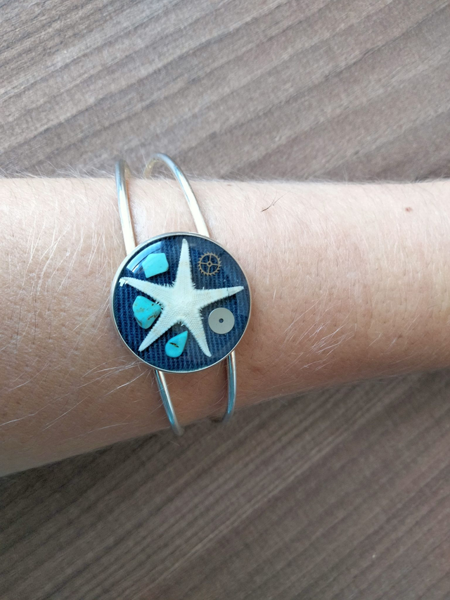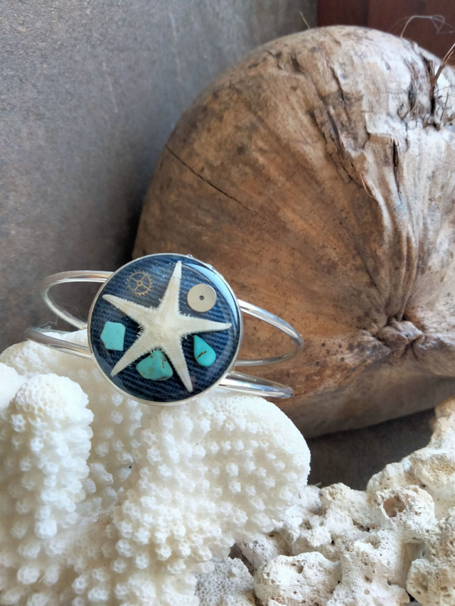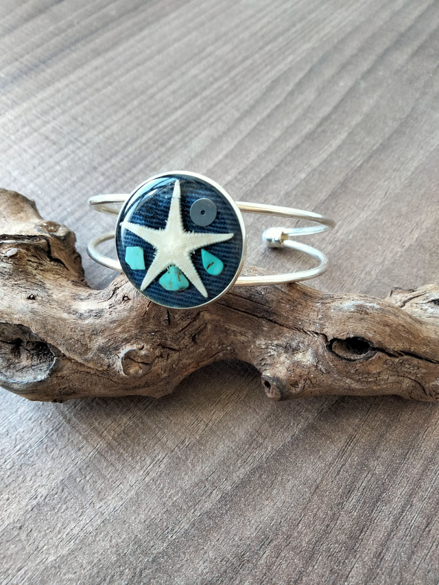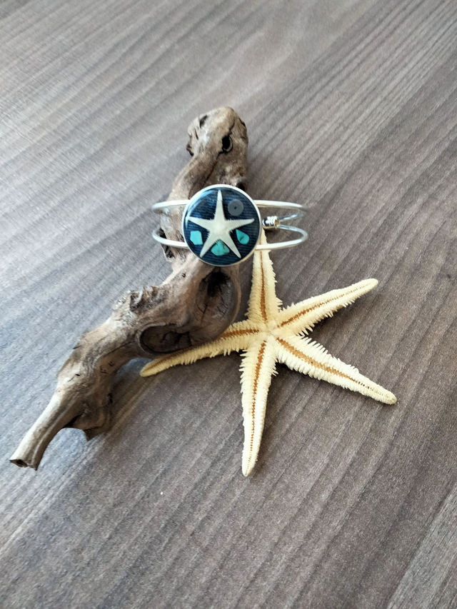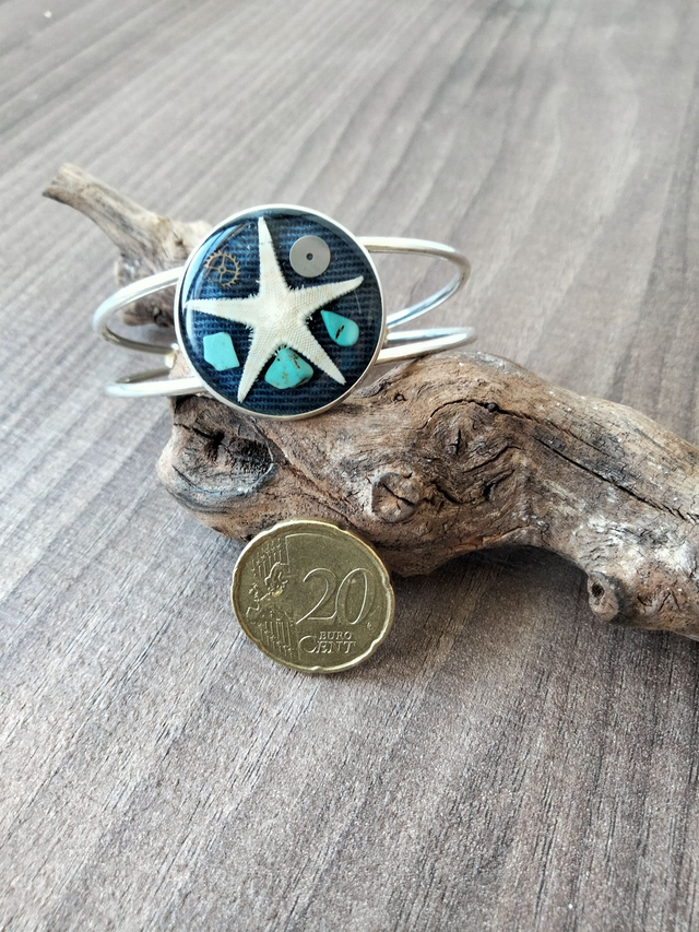 Bracelet réglable en laiton couleur argent avec insertion d'une étoile de mer avec de la résine époxy