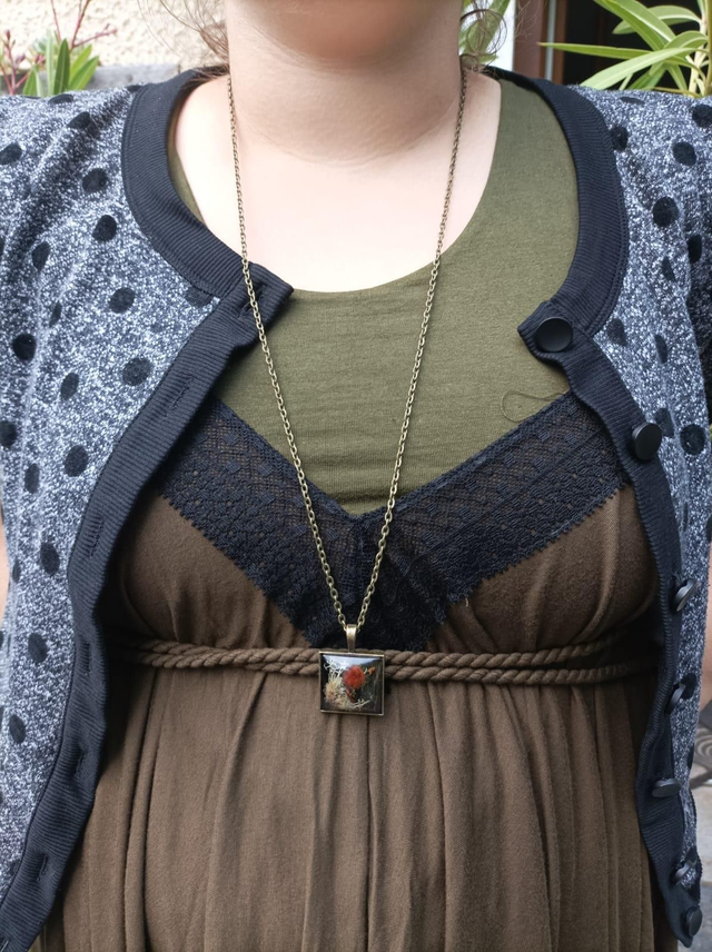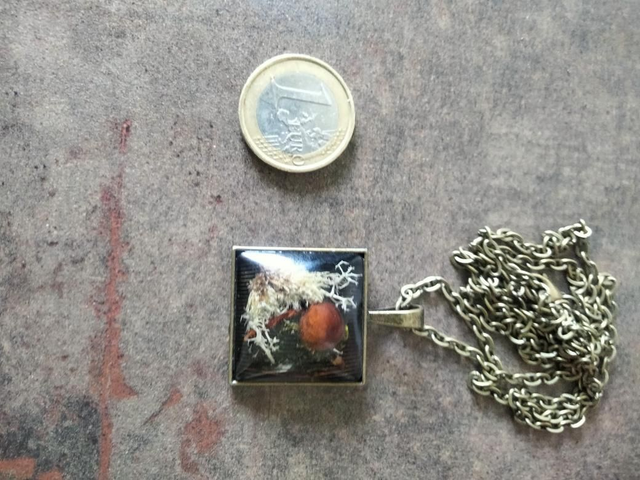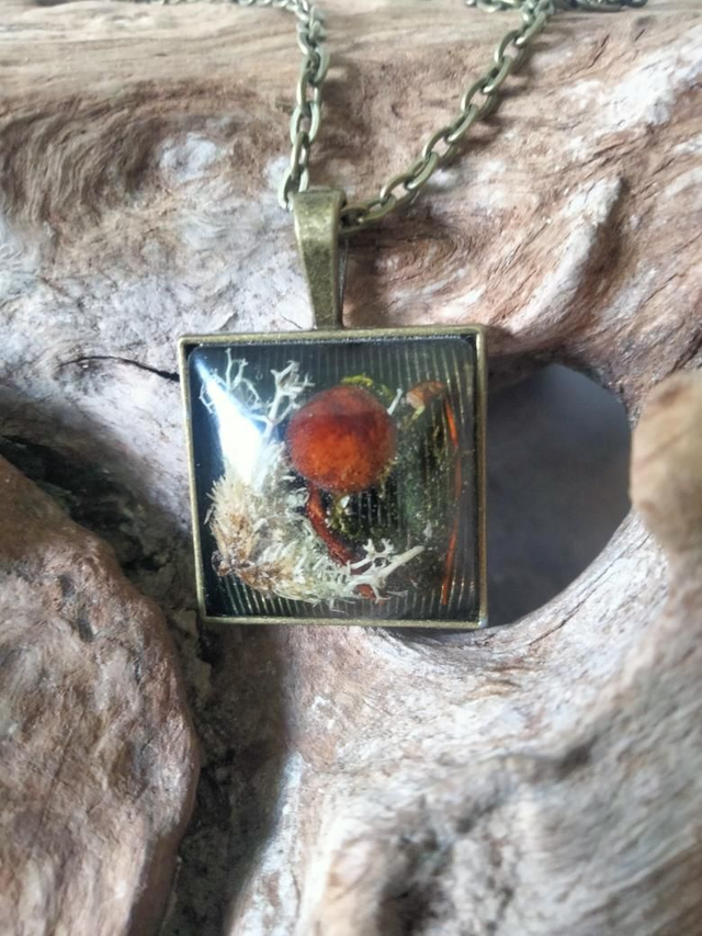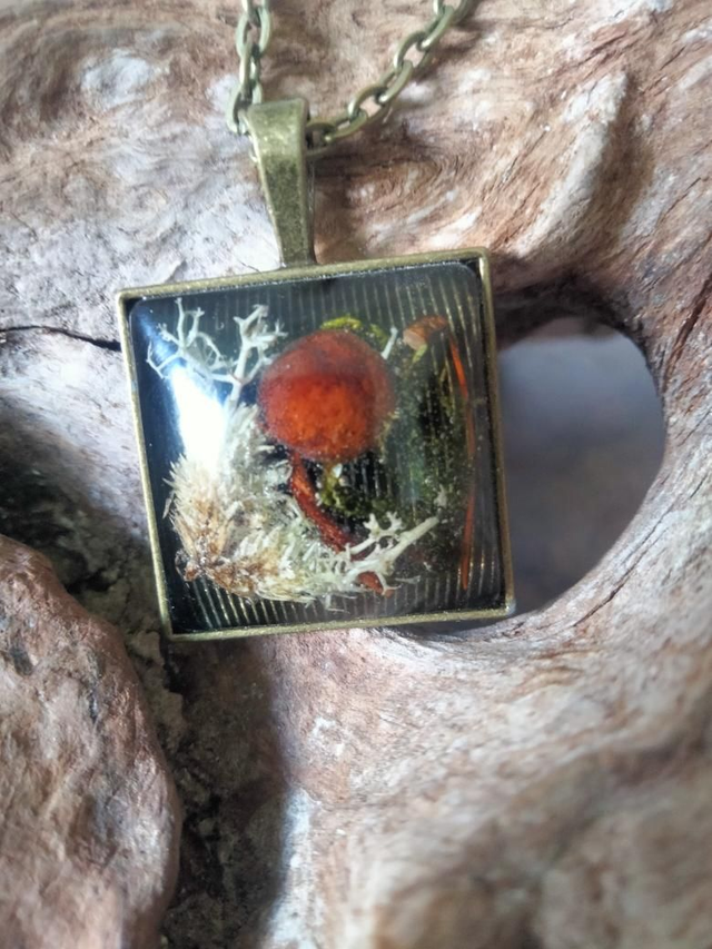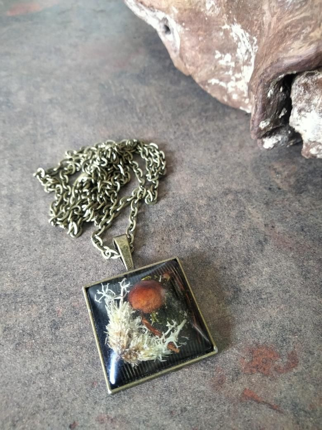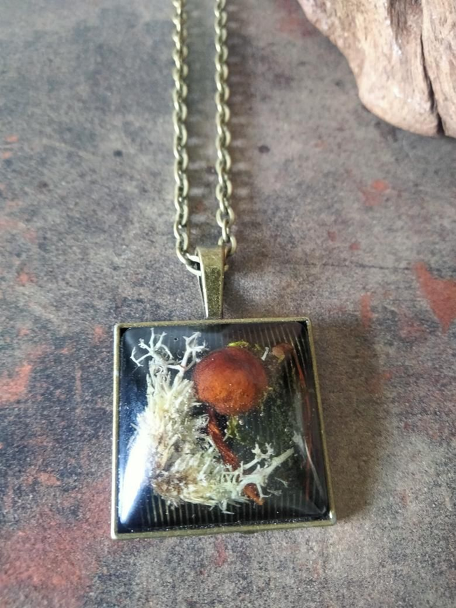 Pendentif carré couleur bronze en alliage avec insertion de mousse de lichen et d'un champignon avec de la résine époxy.