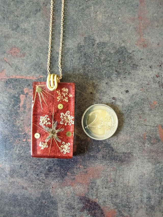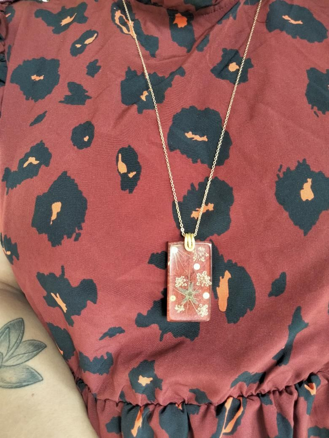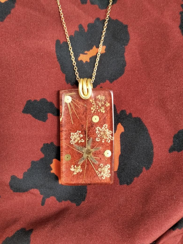 Pendentif en résine époxy avec inclusion de fleurs séchées monté sur chaine en acier inoxydable couleur or