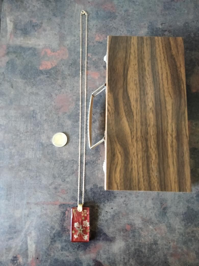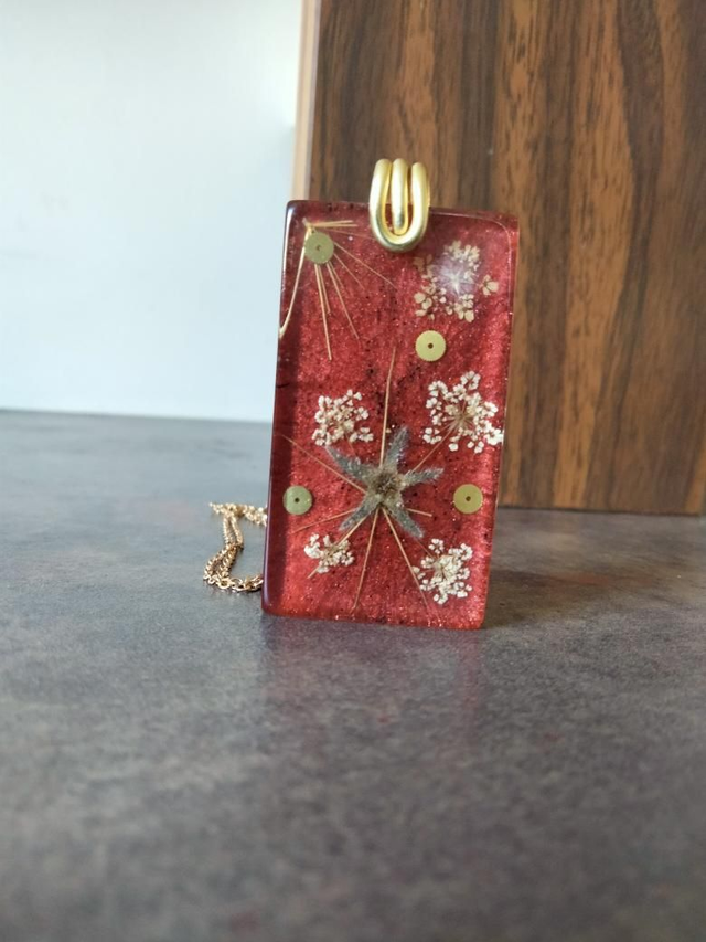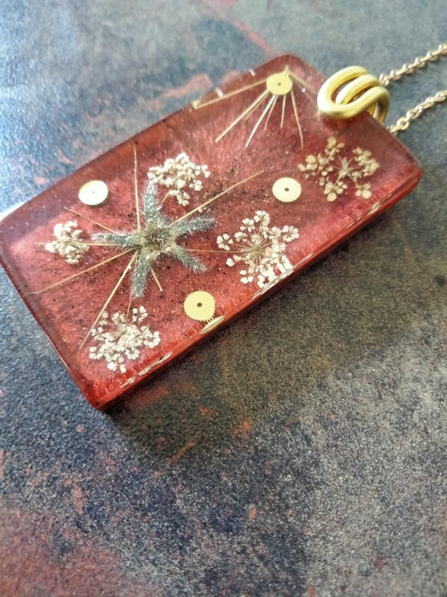 Pendentif en résine époxy forme rectangulaire avec inclusion de fleurs séchées et de pièces de montres.