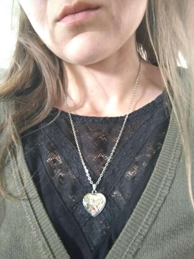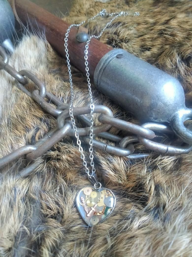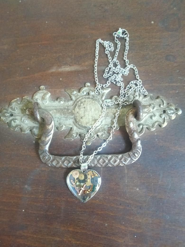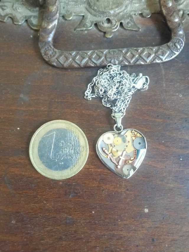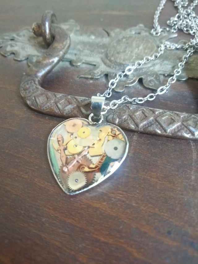Pendentif forme coeur couleur argent en acier inoxydable avec insertion d'un assemblage de pièces de montres à l'aide de résine époxy.