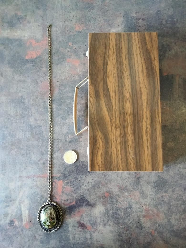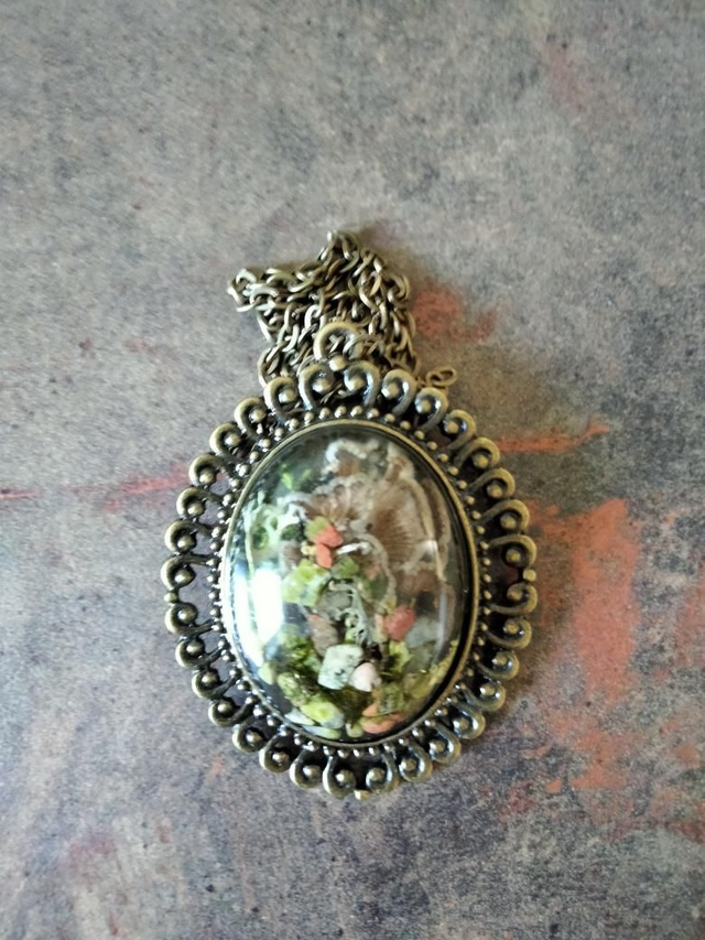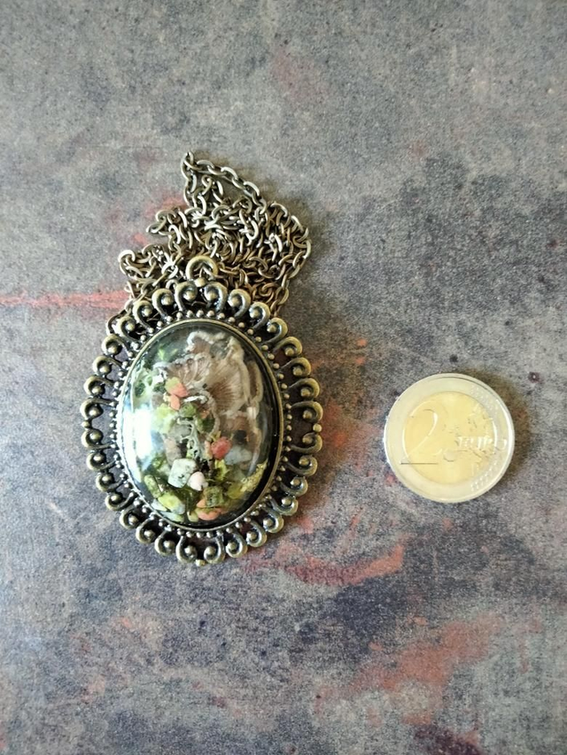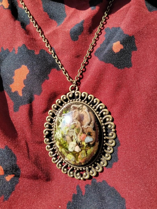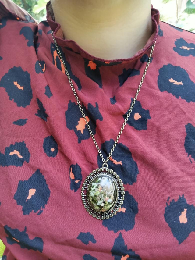 Pendentif grande taille forme ovale avec volutes couleur bronze en alliage avec insertion d'un cabochon en résine époxy thème mini forêt.