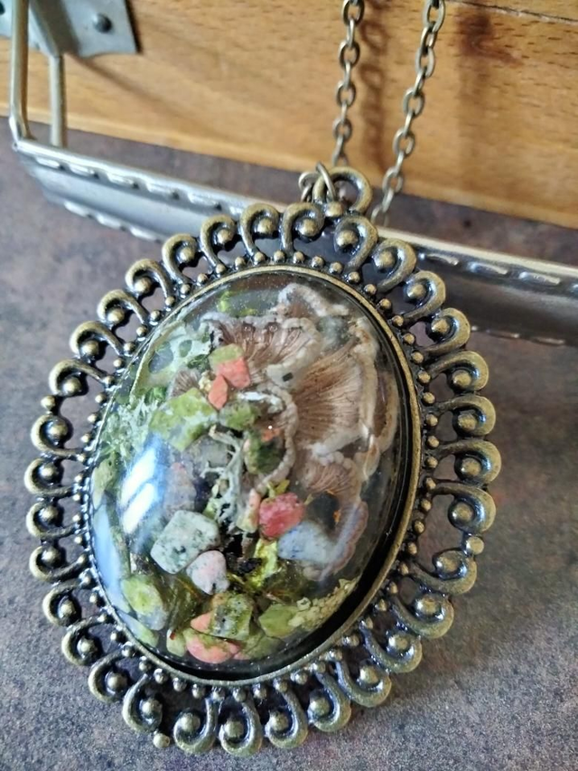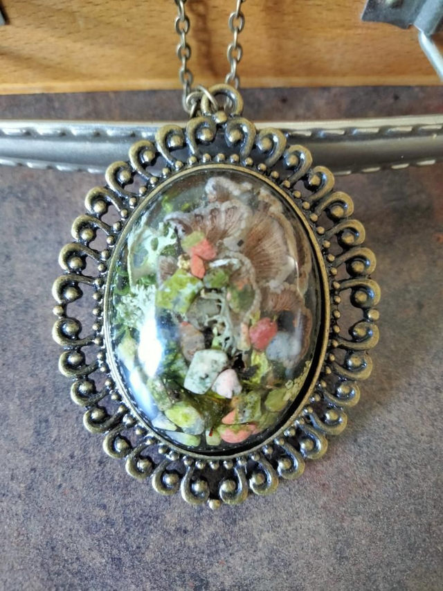 Cabochon réalisé à partir d'une inclusion de pierre semi précieuses, d'une grappe de champignons d'arbres, de mousse et de lichen.