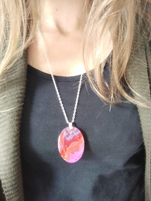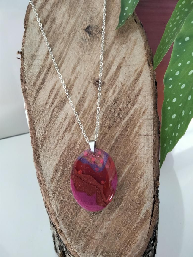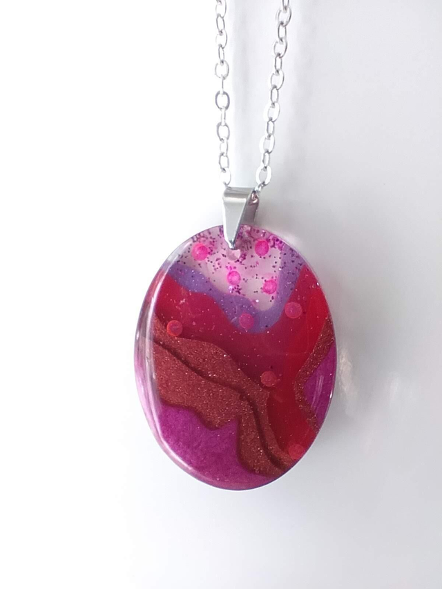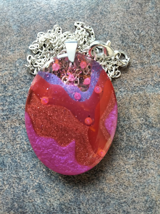 Pendentif graphique en résine époxy forme ovale confectionné à partir de plusieurs couches successives de résine époxy mélangées avec des poudres de mica dans les tons de rose et violet. J'ai inclus également des paillettes et des microbilles.