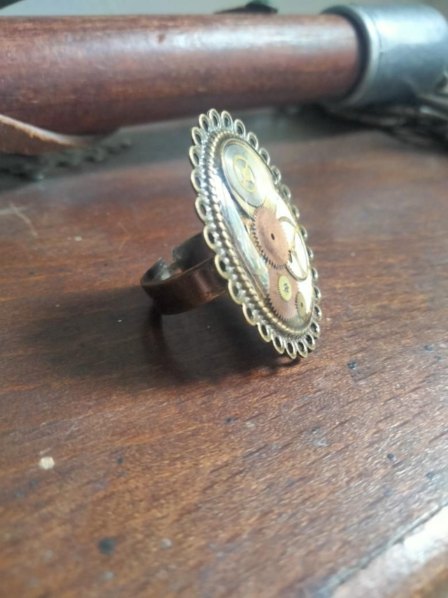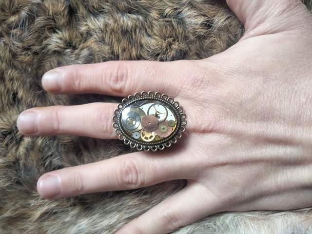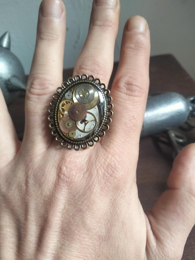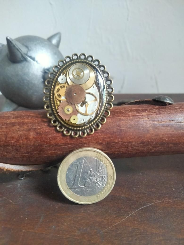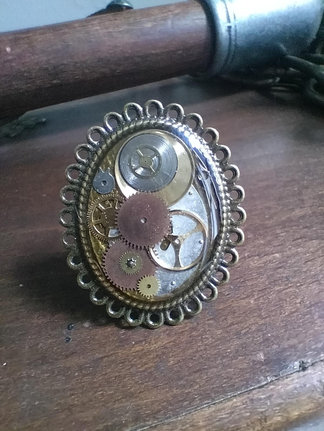 Cabochon réalisé en résine époxy avec une inclusion d'un assemblage de pièces de montres.