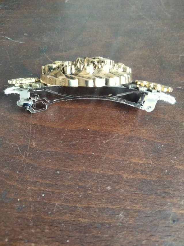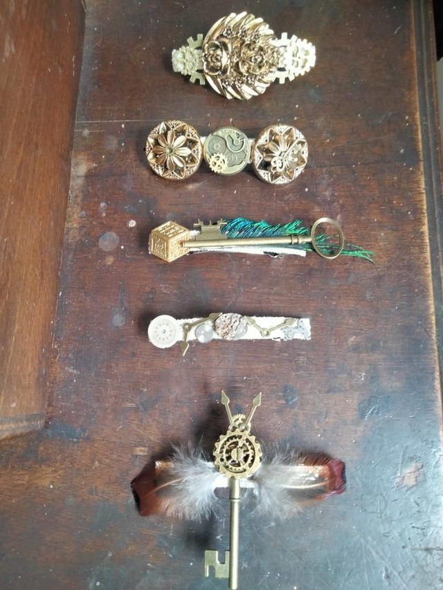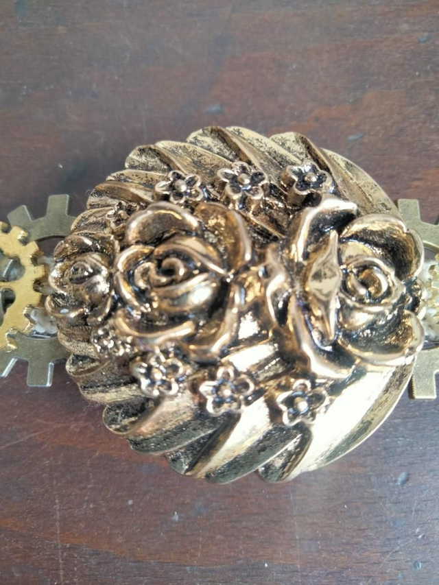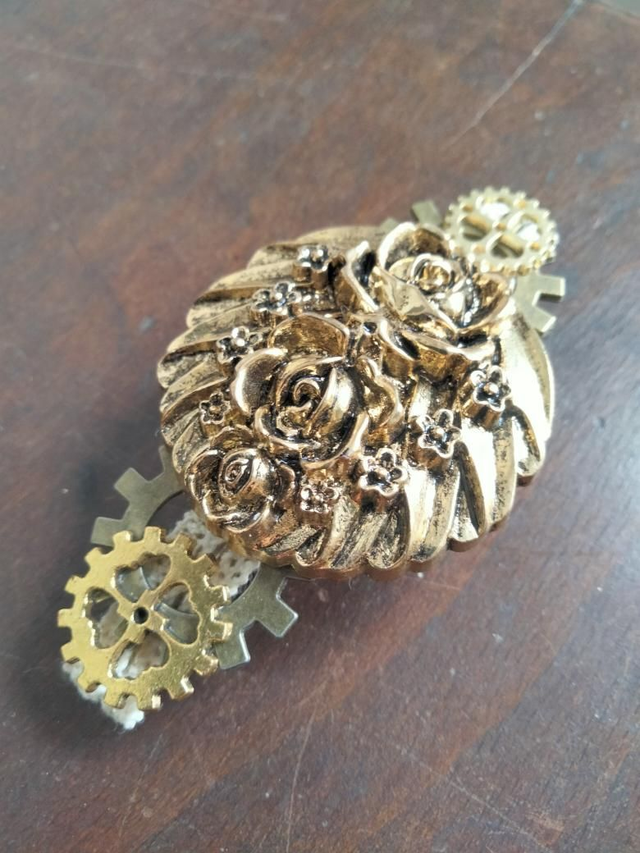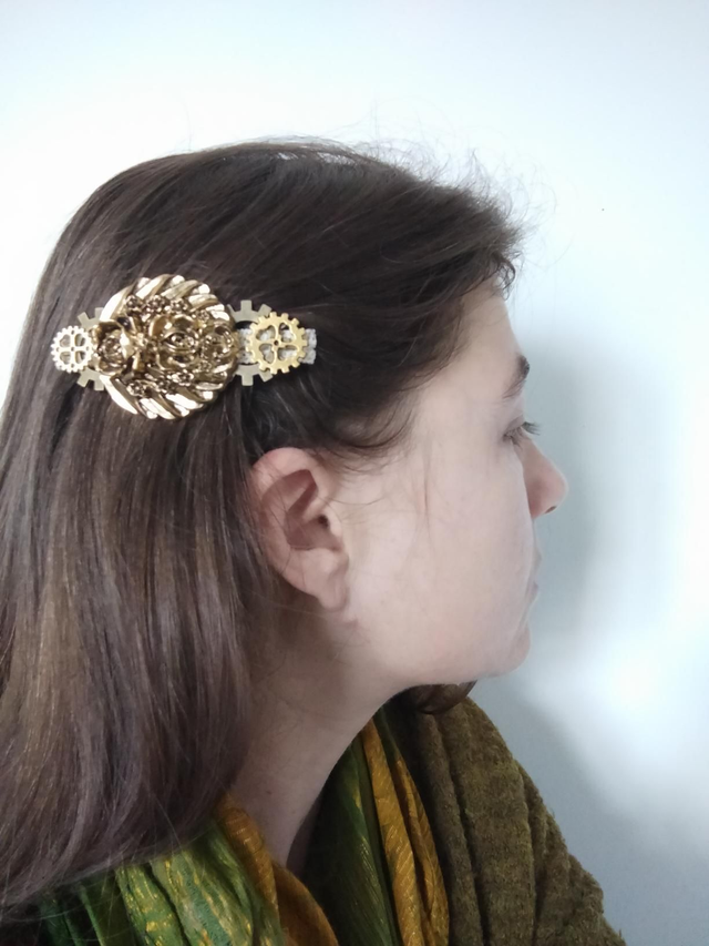 Barrette pour cheveux originale confectionnée à partir de dentelle, d'un bouton ancien floral et des engrenages breloque.