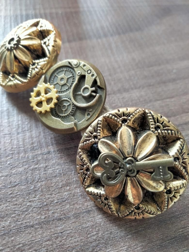 Confectionnée à partir de dentelle, boutons anciens, clés et engrenages breloque.