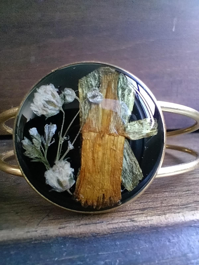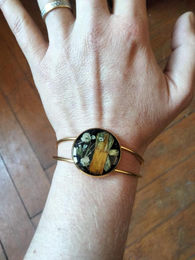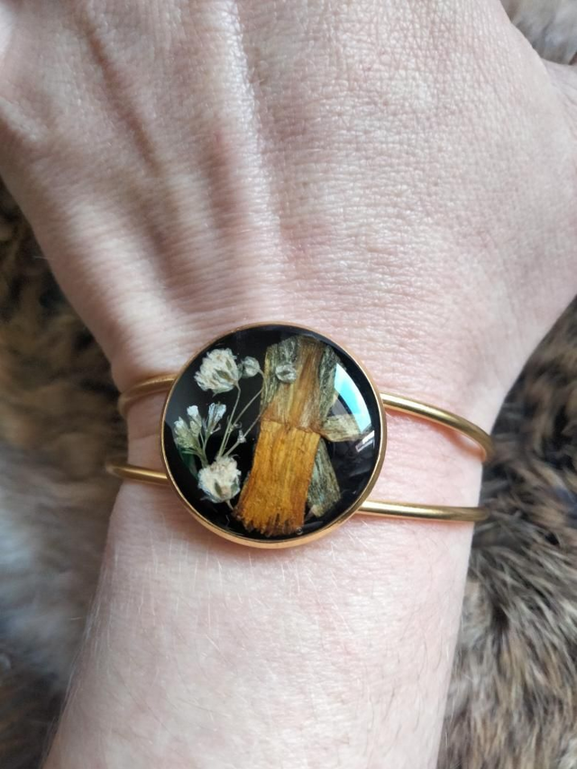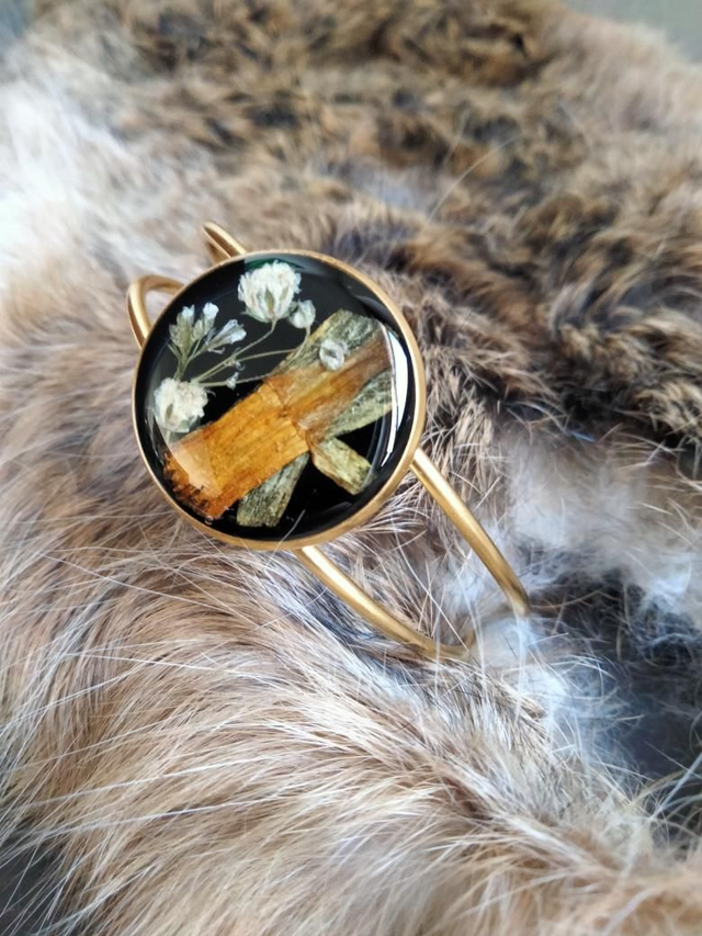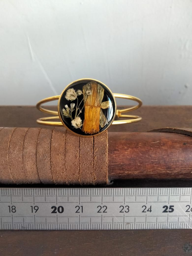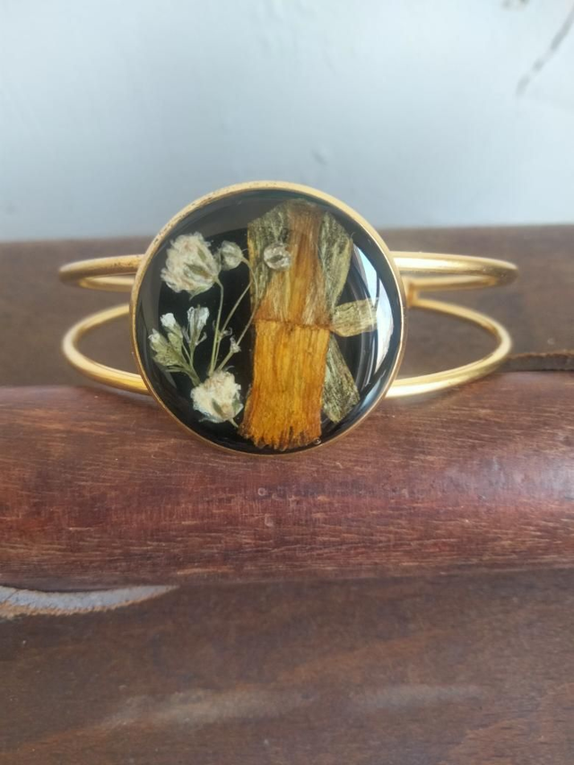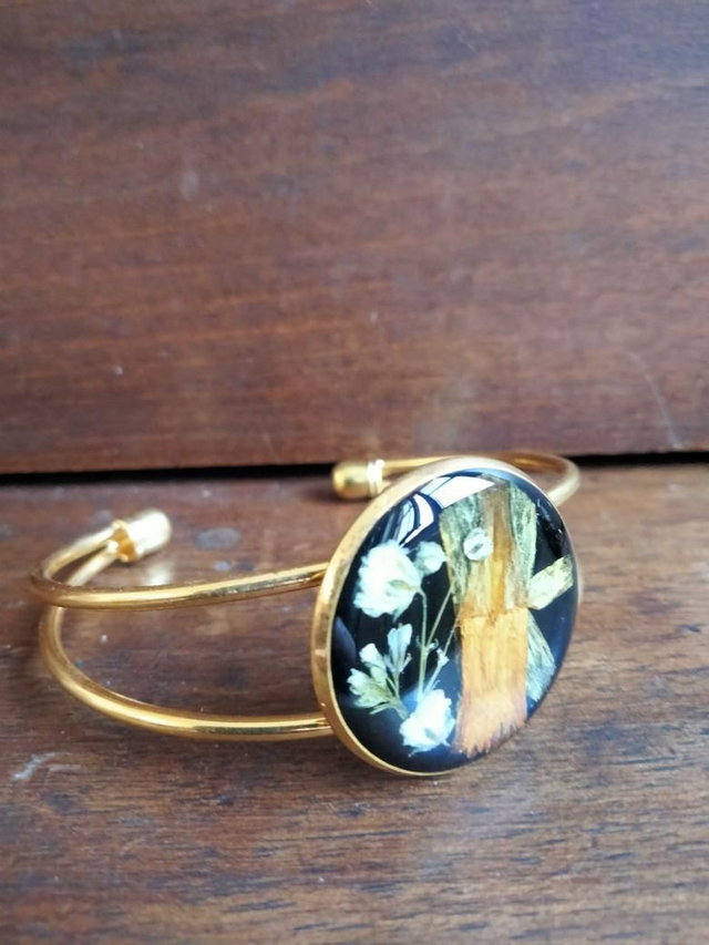 Bracelet manchette réglable couleur or avec insertion de fleurs séchées