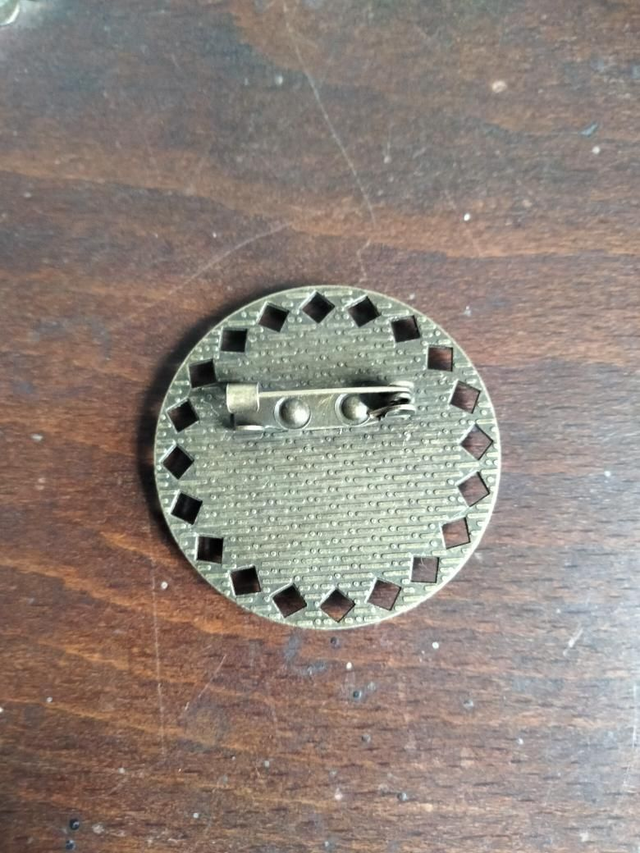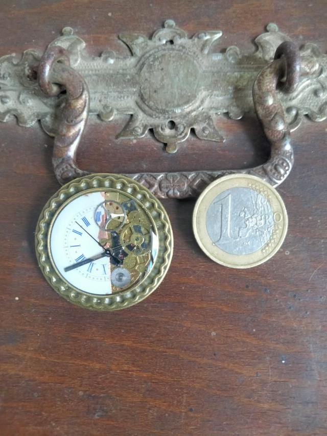 Broche forme ronde couleur bronze avec insertion d'un assemblage de pièces de montres figé avec de la résine époxy.
