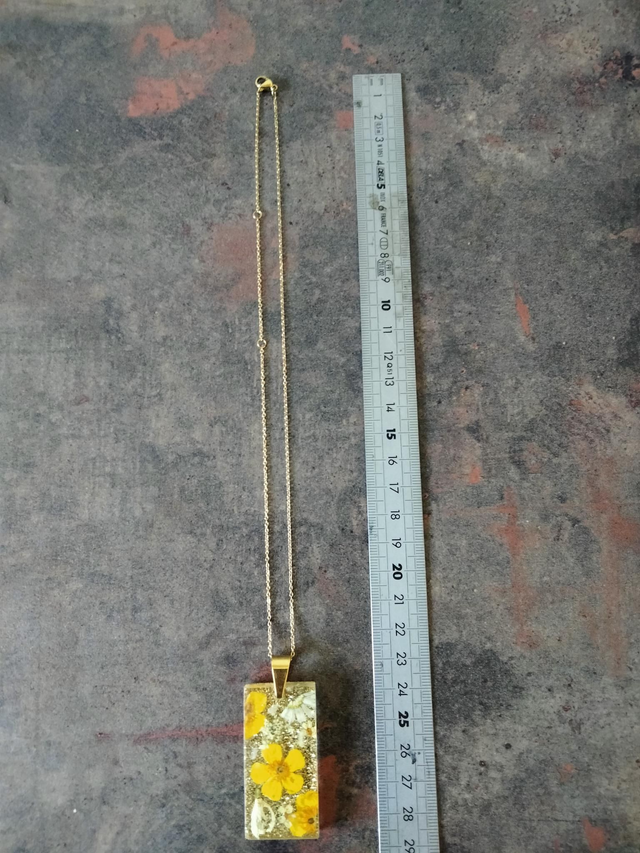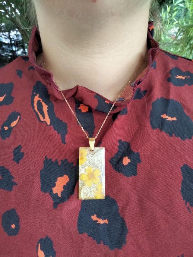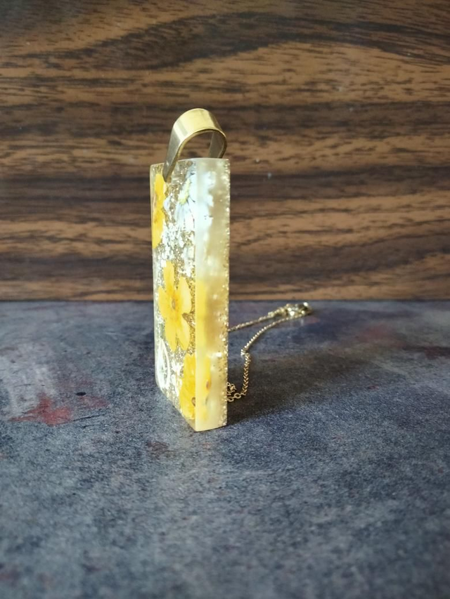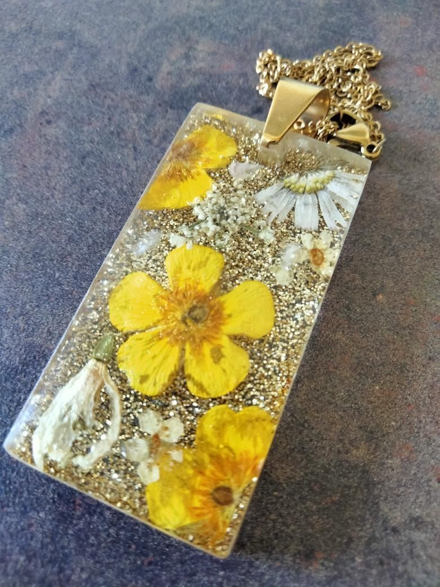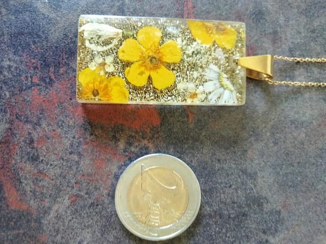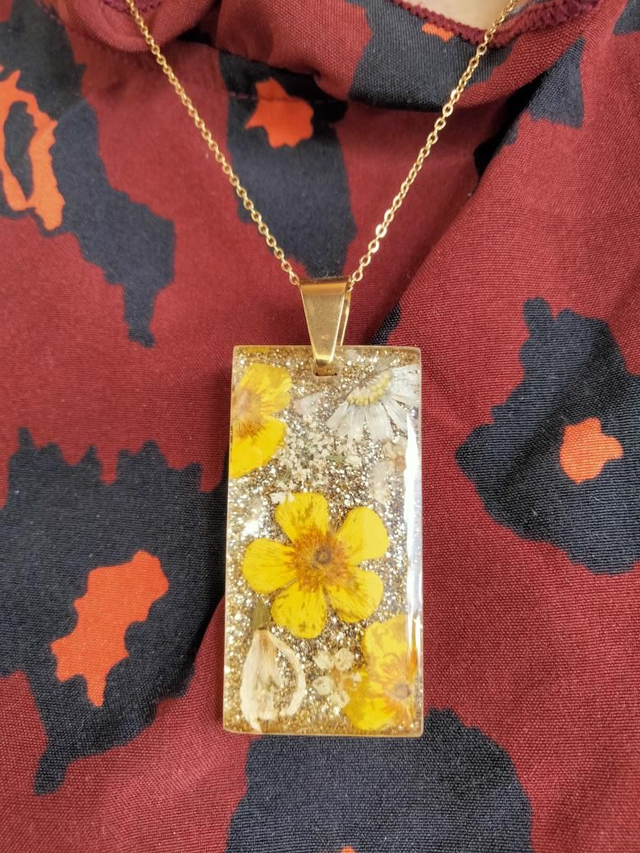 Pendentif en résine époxy forme rectangle avec un fond pailleté doré et insertion d'un assemblage de fleurs séchées.