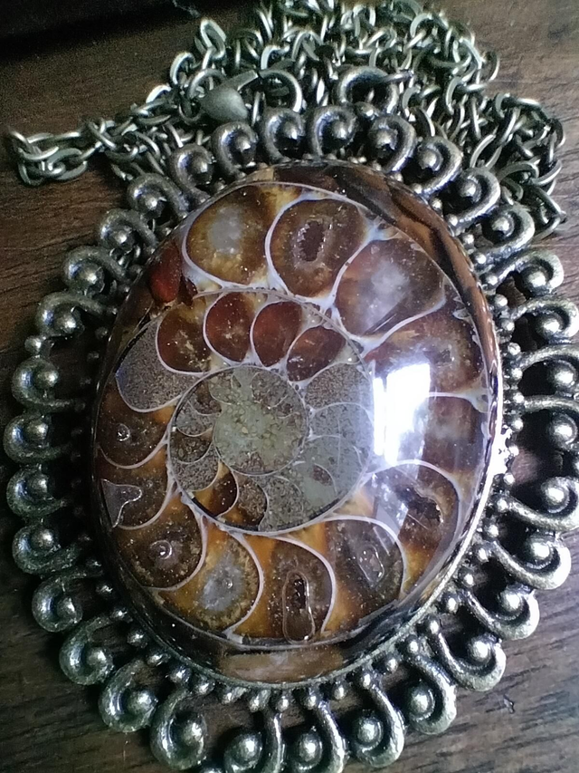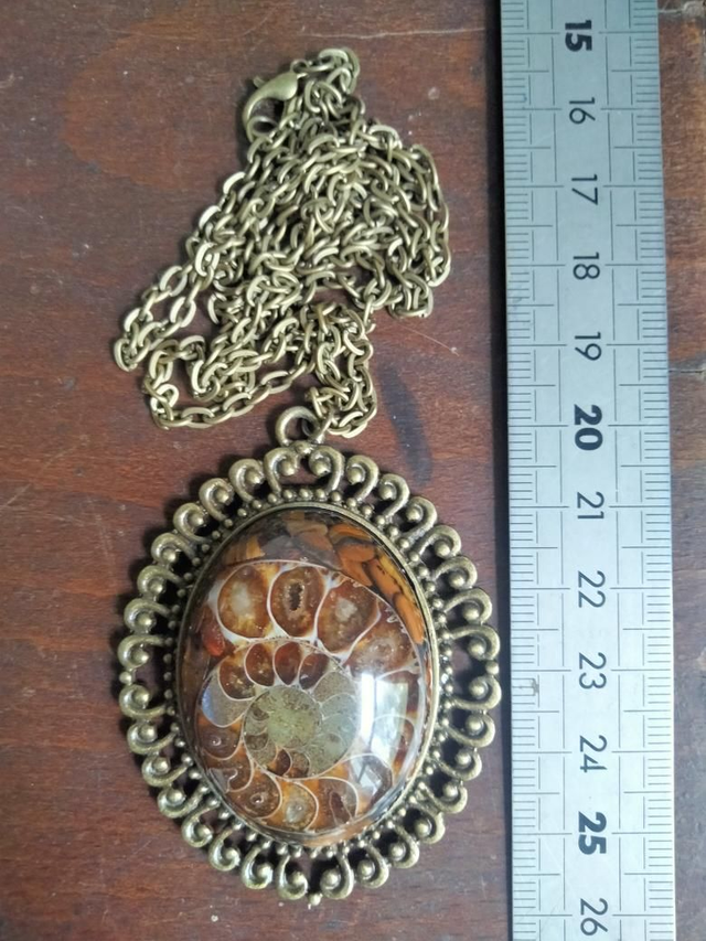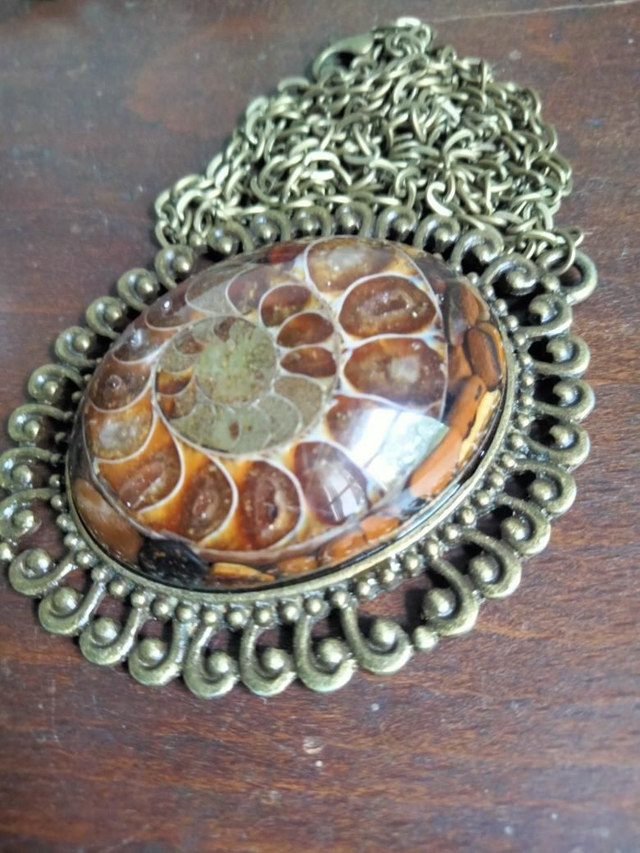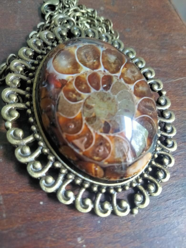 Cabochon central en résine époxy avec insertion d'une ammonite et de copeaux de pierre semi précieuse d'œil de tigre.
