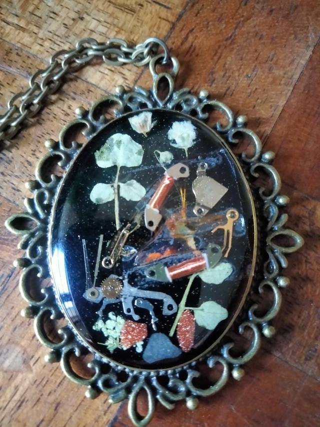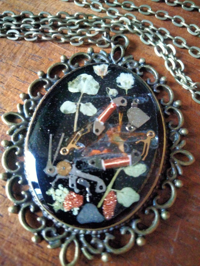 Insertion d'une aile de papillon, de pièces de montres et d'éléments de la nature avec de la résine époxy.