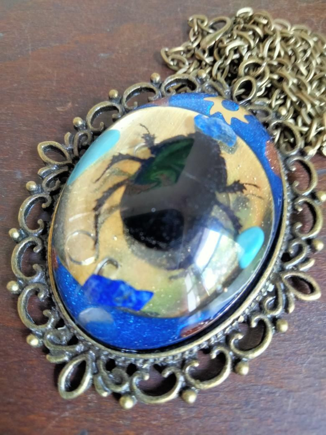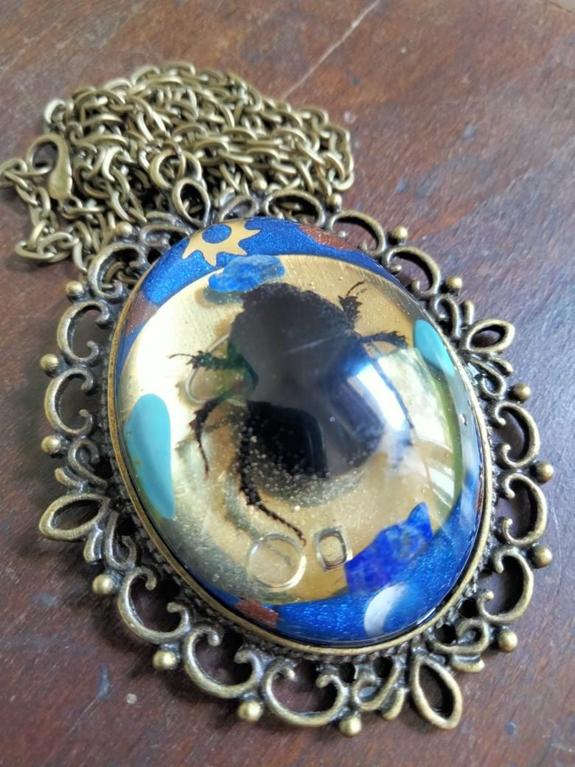 Encollage d'un cabochon en résine époxy dans lequel a été inséré un scarabée des bois (trouvé mort), des pierres semi précieuses de lapis lazuli, de turquoise et d'aventurine et des pièces de montres.