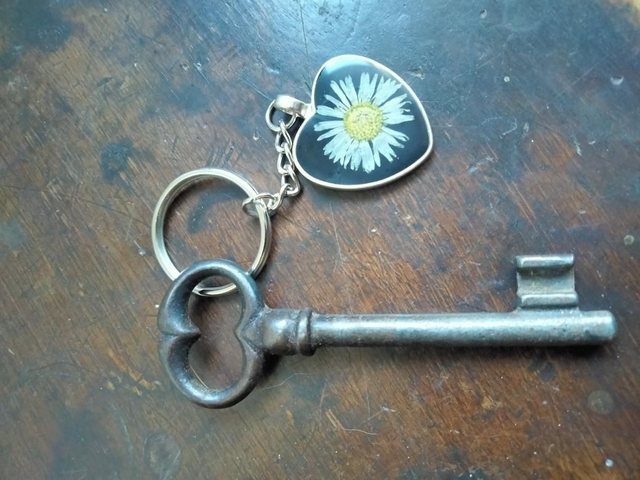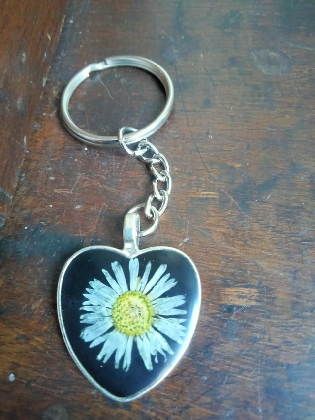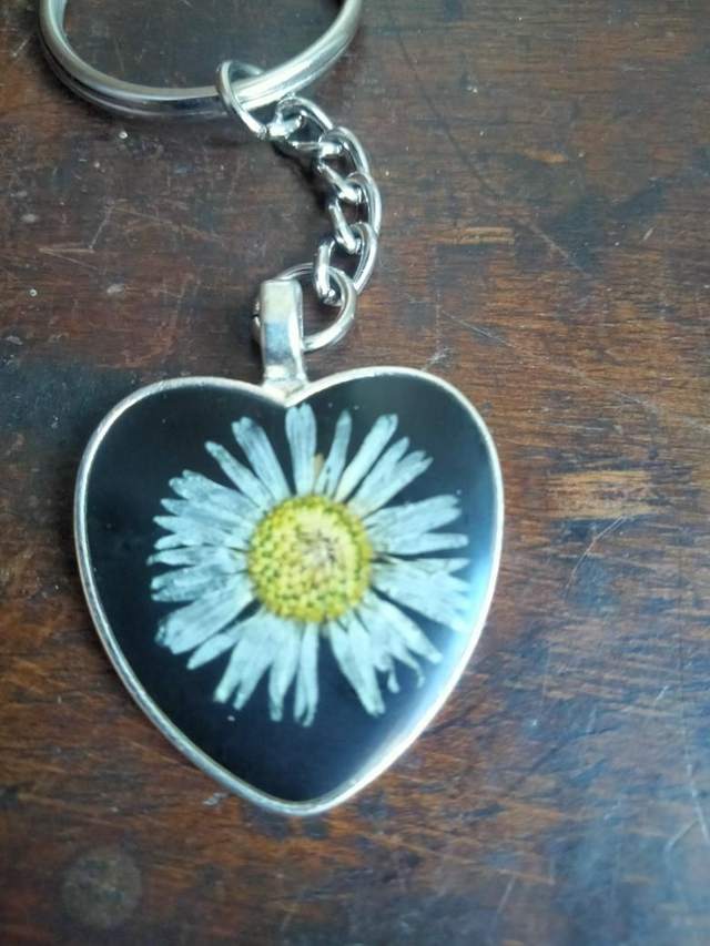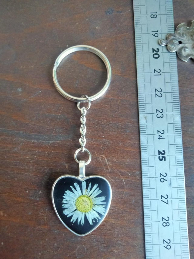 Porte clé forme coeur avec inclusion d'une fleur séchée de pâquerette